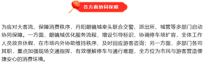为应对大客流、保障消费秩序,丹阳眼镜城牵头联合交警、派出所、城管等多部门启动协同保障。一方面,眼镜城优化服务流程,增设引导标识,协调停车场扩容,全体工作人员放弃休假,在市场内外协助维持秩序,及时回应游客咨询;另一方面,多部门各司其职,重点加强现场交通指挥,有效缓解停车与通行难题,全方位为市民与游客营造便捷安心的消费环境。