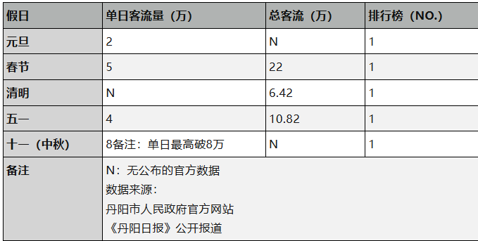 结合丹阳市人民政府官网、《丹阳日报》等权威渠道发布的数据,该景区在元旦、春节、清明、五一、十一等重要节假日的客流表现如下: